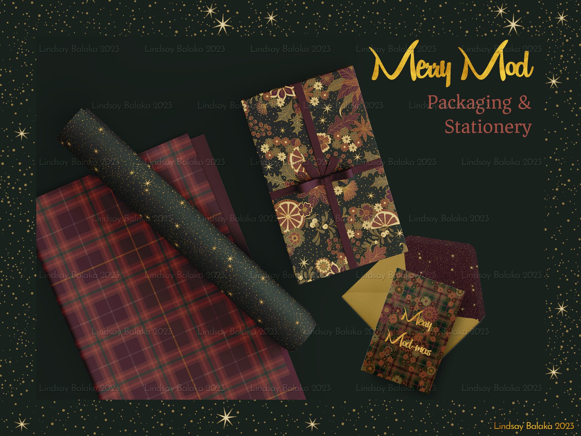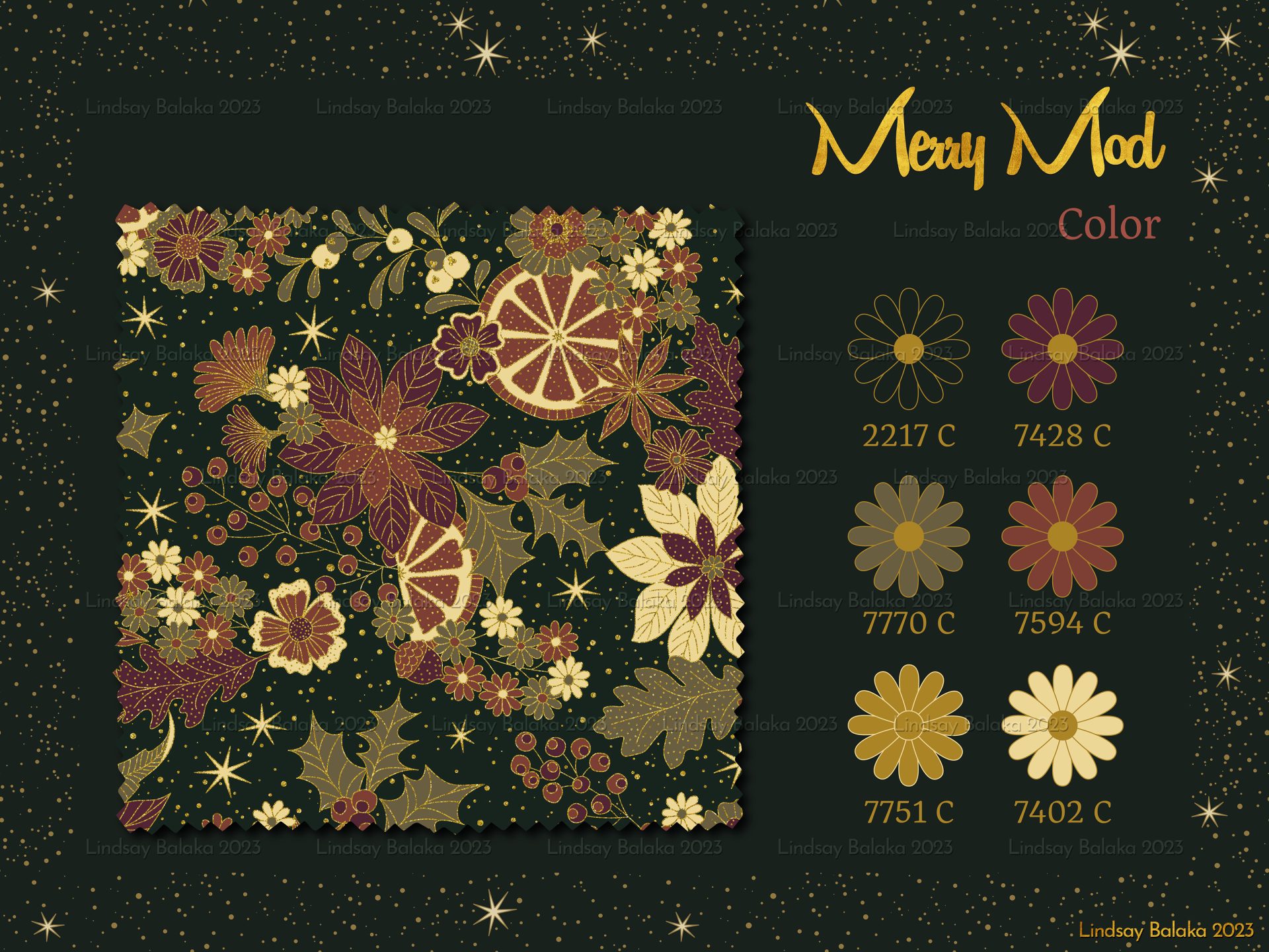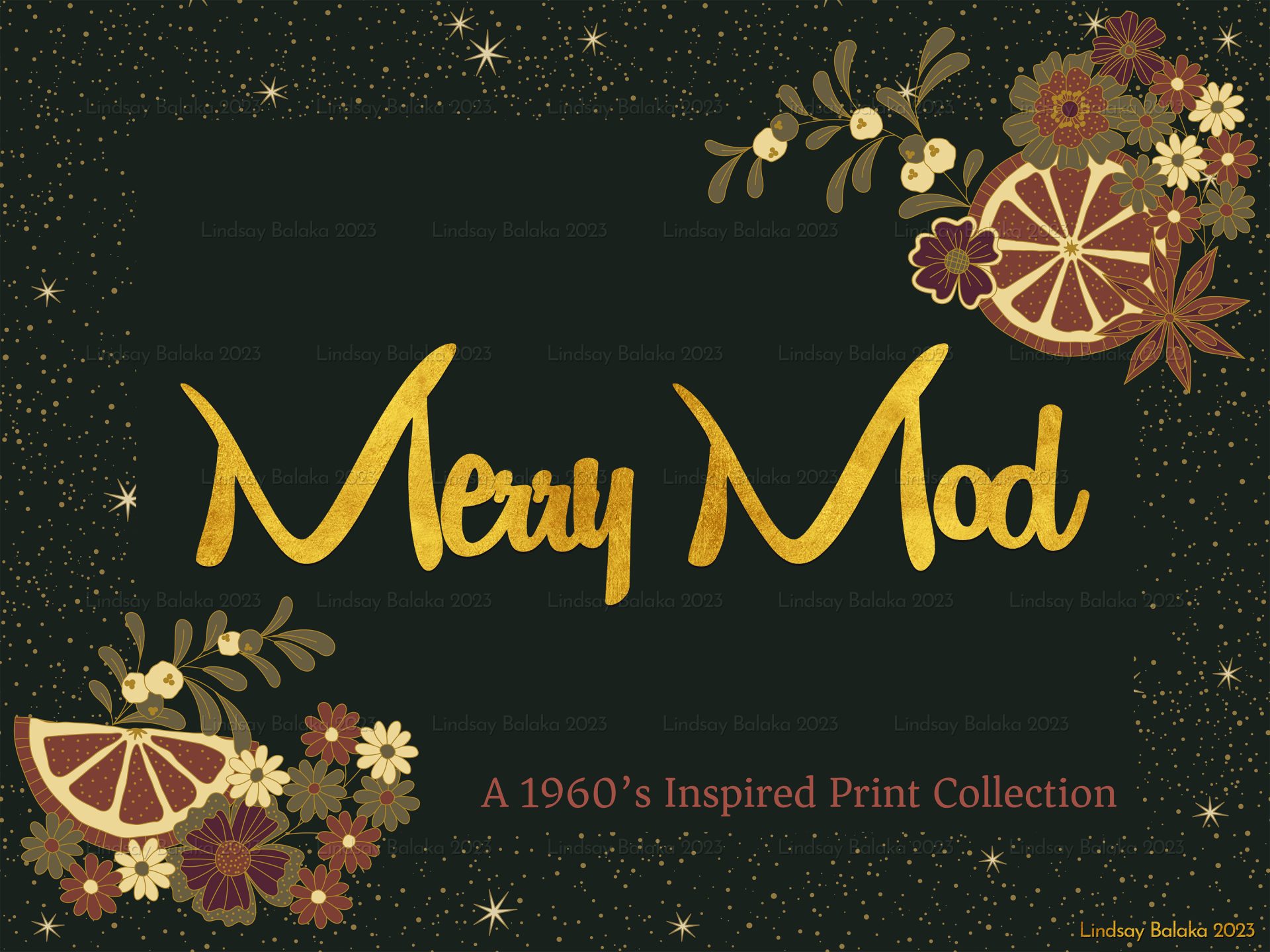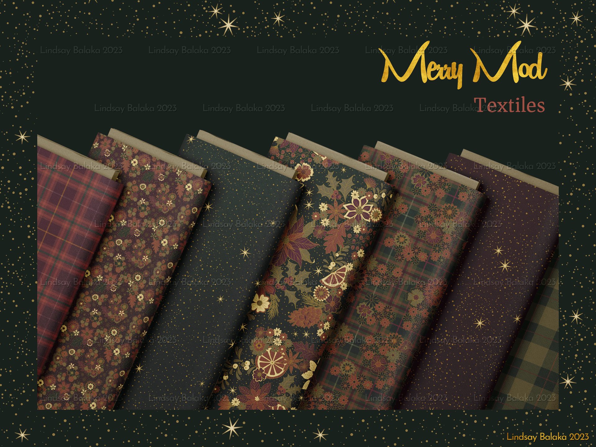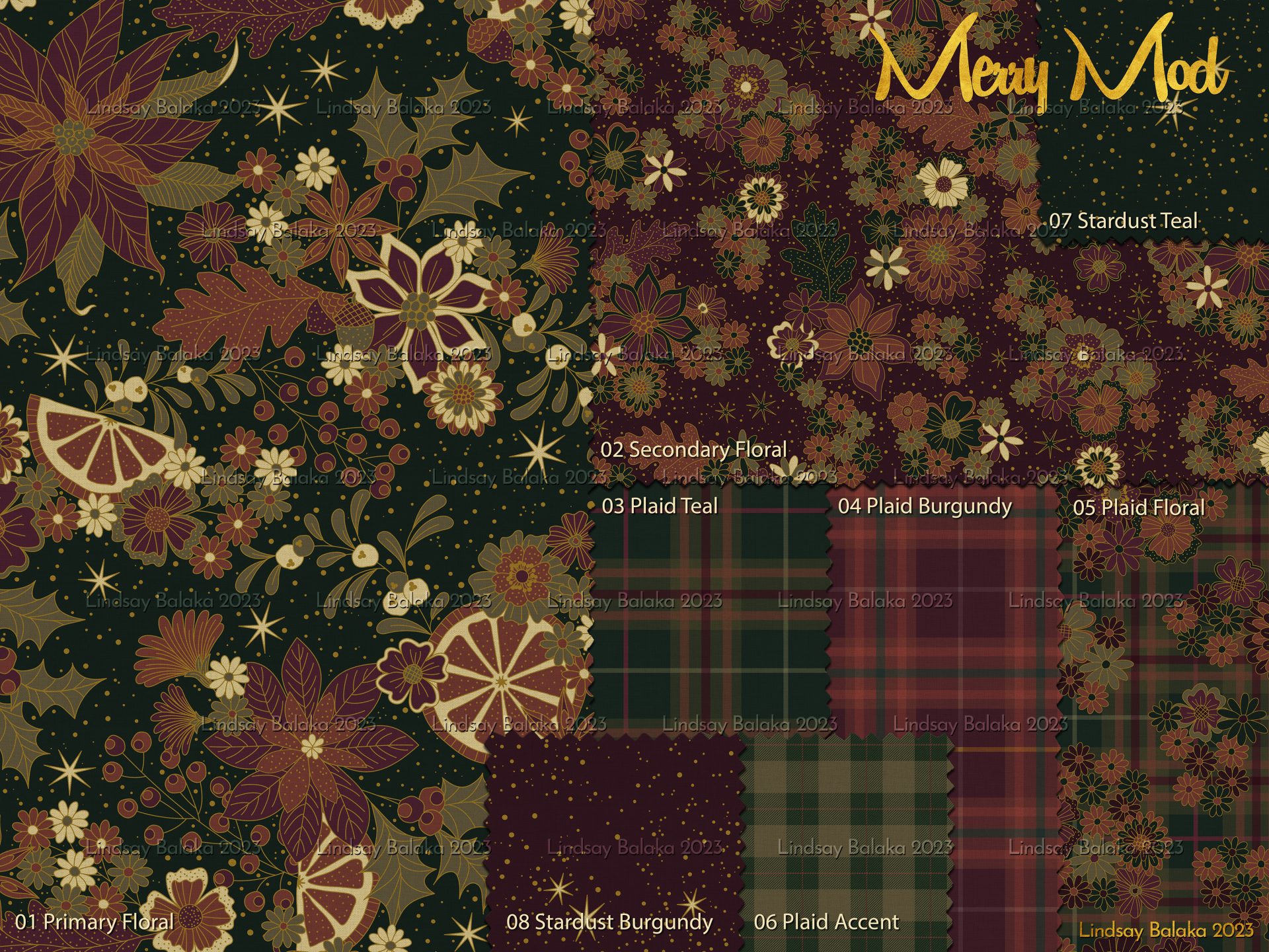 A 1960’s inspired print collection featuring mod style florals with holiday plaids. Designed for versatile use from textiles to home goods and packaging.